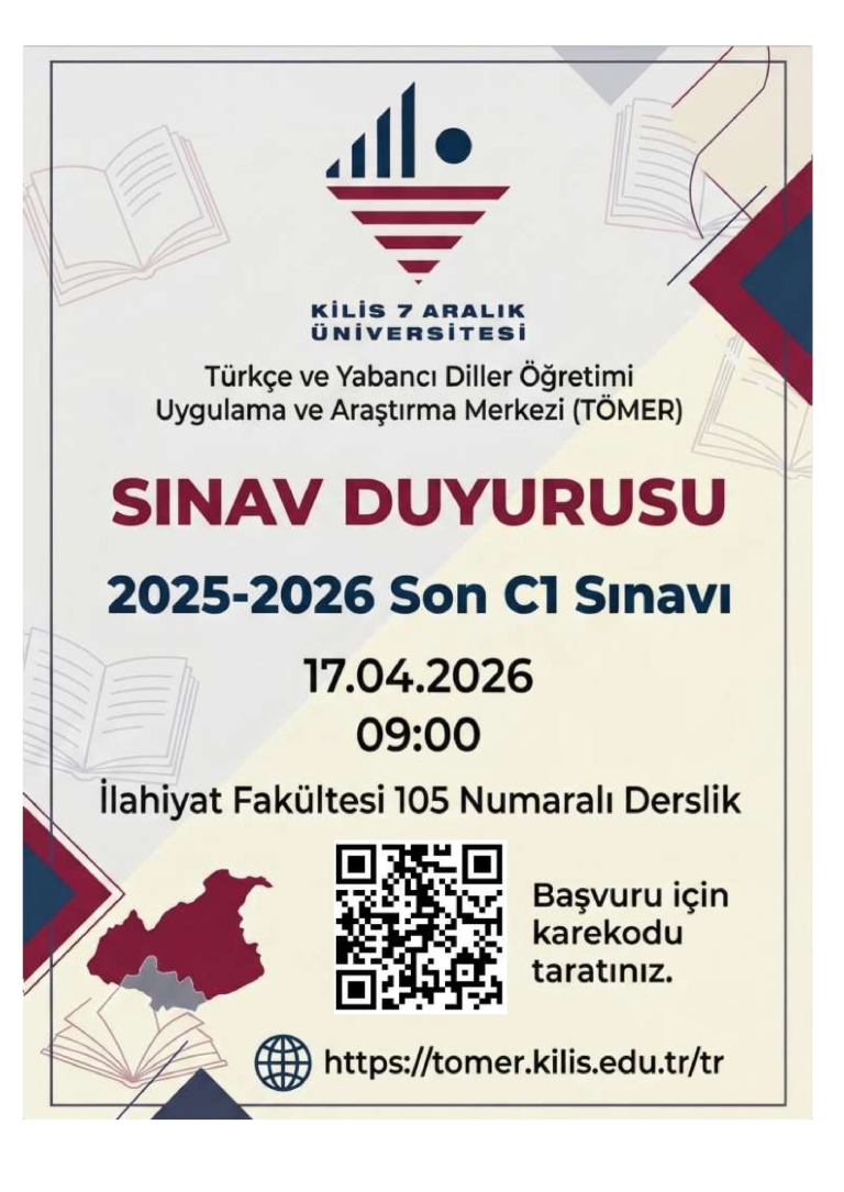 17.04.2026 Cuma günü saat 09.00'da mezun durumda olan ancak C1 belgesine sahip olmayan yabancı uyruklu öğrencilerimiz için C1 sınavı yapılacaktır. Sınava katılmak isteyen öğrenciler aşağıdaki form üzeerinden başvuru yapabilirler.
